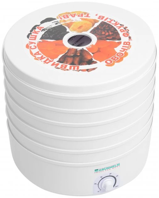 Сушарка для овочів та фруктів Grunhelm BY1162 - чудовий пристрій, призначений для швидкого сушіння різних овочів та фруктів з максимальним збереженням вітамінів та корисних мікроелементів. Незважаючи на свої компактні розміри, вона здатна забезпечити ефективне обдування 5-ти містких піддонів, загальним обсягом 20 літрів.