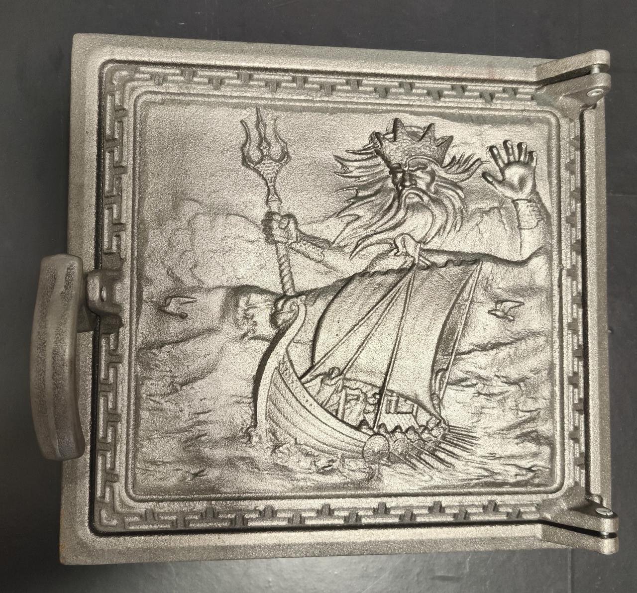 Дверка топочна "Нептун" Т2 – чавунні дверцята для топки з візерунком "Нептун". Тип: Дверка топочна; Матеріал: Чавун; Розмір: 270×290 мм; Дизайн: Нептун