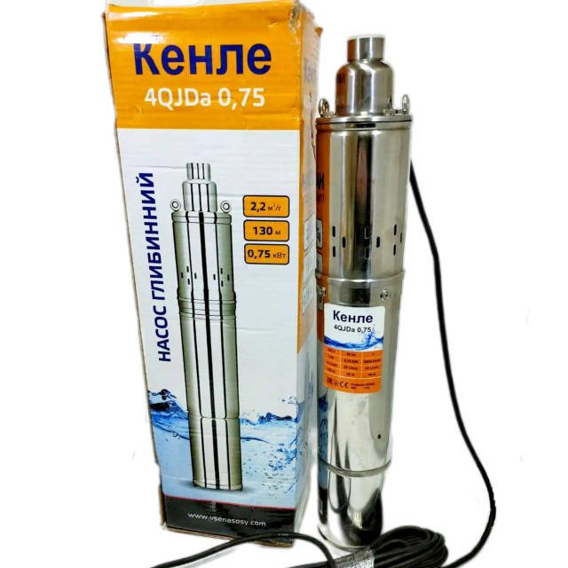 Тип насоса: Глибинний; Конструкція: Шнековий; Потужність: 0.75 kW; Кабель: 10 м; Матеріал: для свердловин (діаметр 4 дюйми), побутове водопостачання.
