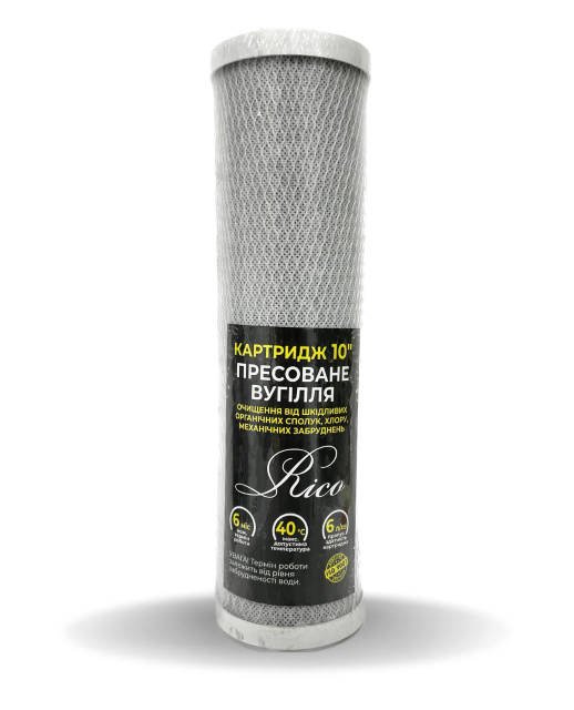 СантехнікаКартридж RICO з пресованого вугілля 10 дюймів — це змінний фільтруючий елемент, призначений для тонкого очищення води. Він ефективно видаляє хлор, органічні домішки, пестициди та покращує смакові якості, колір і запах води. Картридж встановлюється у стандартні колби фільтрів типорозміру 10 дюймів.