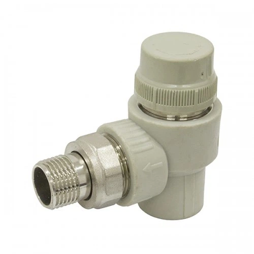 Кутовий радіаторний кран для подаючої лінії опалення, призначений для підключення до верхньої труби радіатора та зміни напрямку потоку на 90° для зручності монтажу.