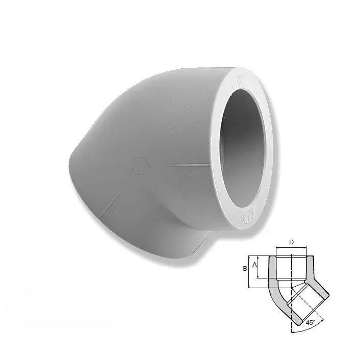 Характеристики: Діаметр труби: 25мм. Кут повороту: 45∘. Матеріал: Поліпропілен (PPR).