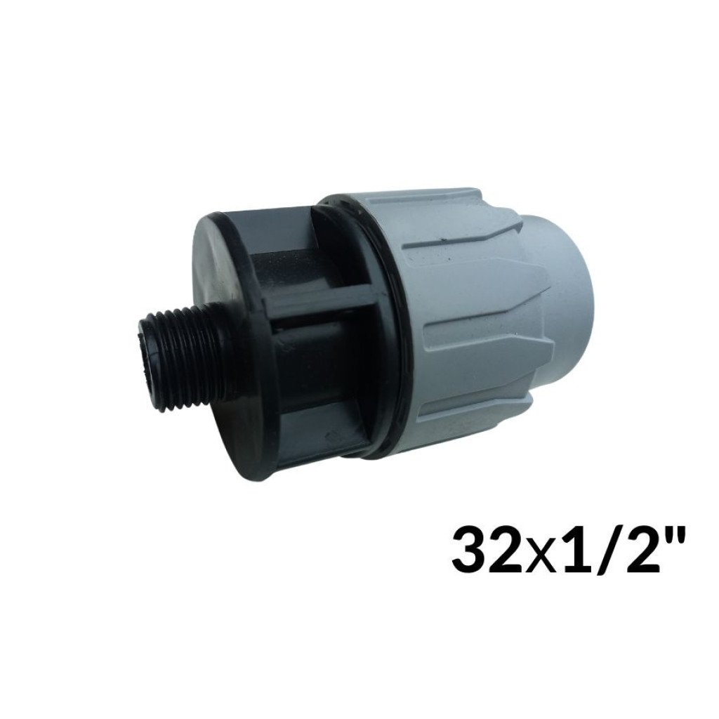 Муфта компресійна ПНД 32 мм×1/2 дюйма Зовнішня – фітинг для прямого переходу з ПНД труби 32 мм на зовнішню різьбу 1/2 дюйма.