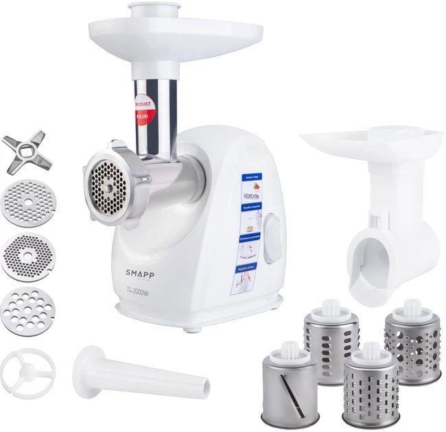 М’ясорубка SMAPP 489.81 2000 Вт з шинковкою — це багатофункціональний кухонний помічник, який поєднує потужність, надійність та універсальність. Вона дозволяє швидко готувати м’ясні страви, домашні ковбаси, паштети та овочеві салати, роблячи процес приготування легким і комфортним.