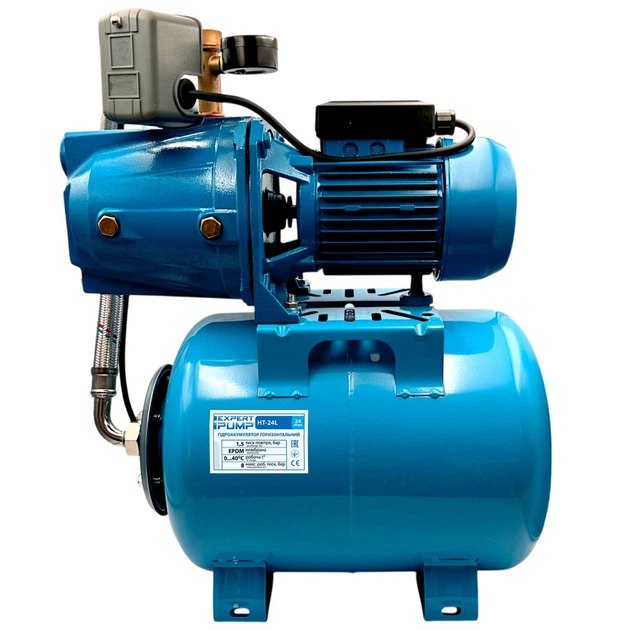 Тип насоса: Поверхневий; Конструкція: Відцентровий (Jet); Потужність: 1.1 kW; Кабель: ; Матеріал: Чавун; Додатково: гідроакумулятор 24 л для побутового водопостачання, підвищення тиску