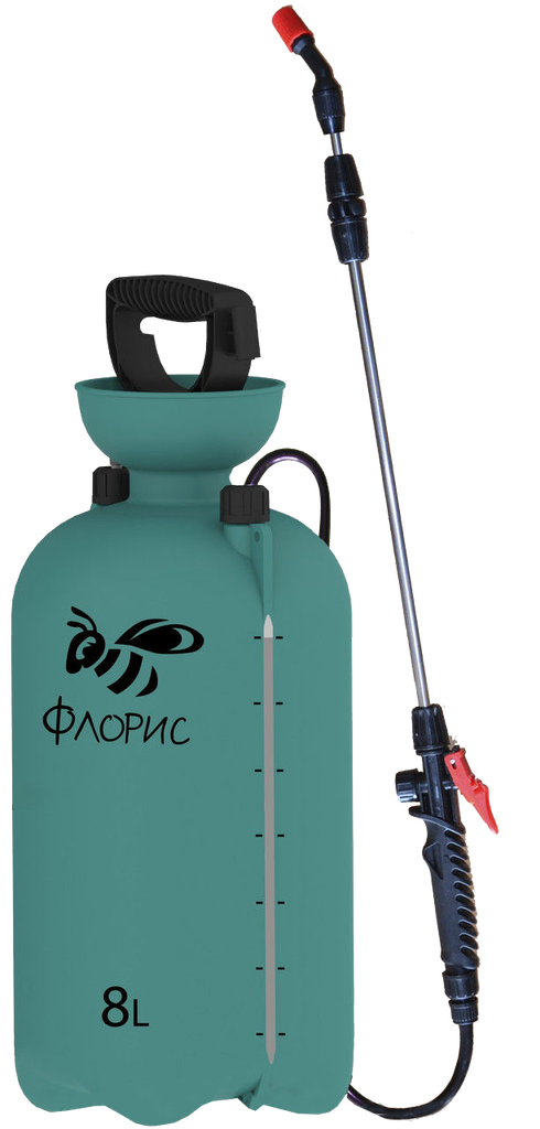 Обприскувач "Флорис" 8 л – пневматичний обприскувач об'ємом 8 л зеленого кольору. Тип: Обприскувач пневматичний; Об'єм: 8 л; Серія: Флорис
