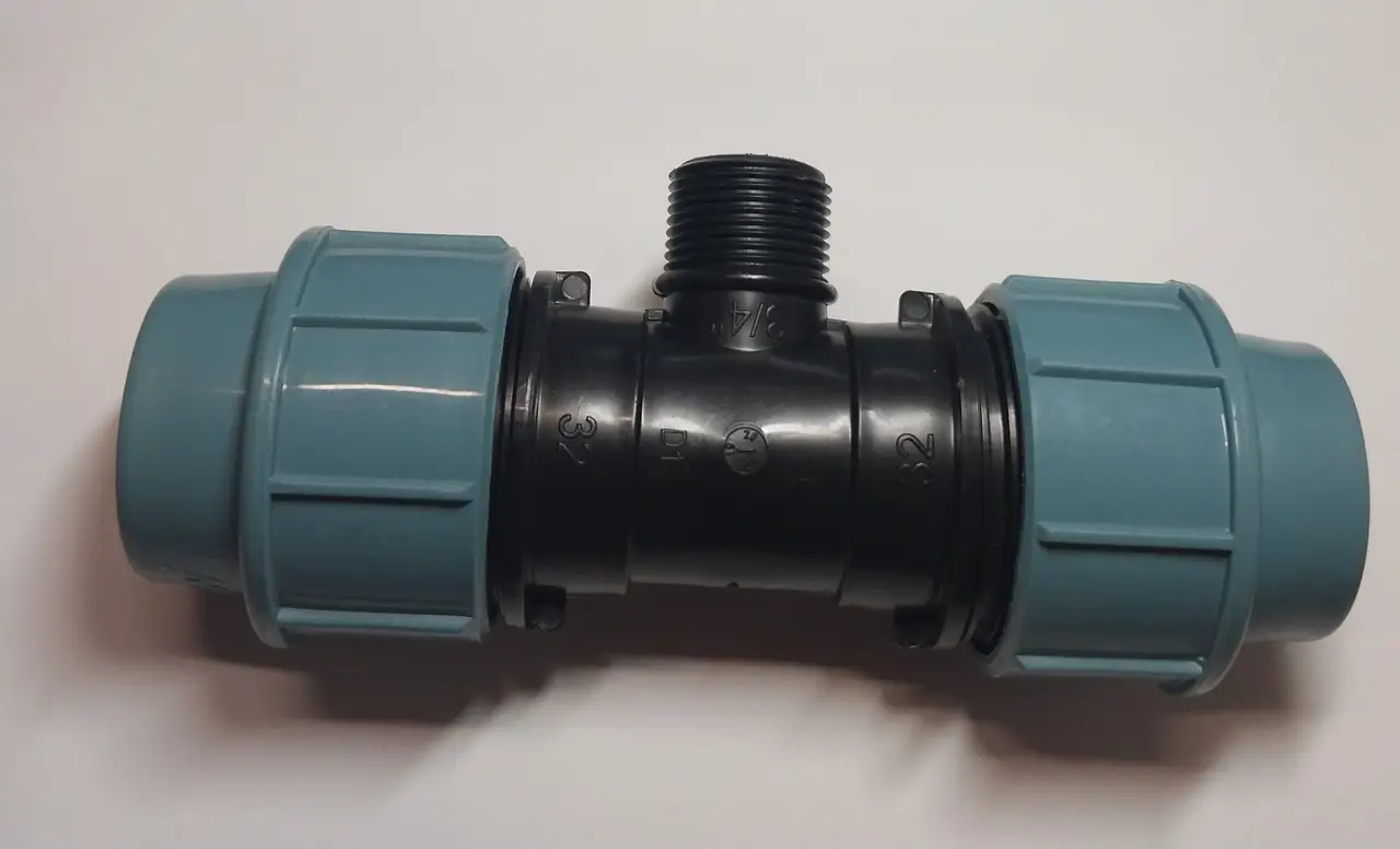 Компресійний трійник із поліетилену низького тиску (ПНД) призначений для розгалуження трубопроводу діаметром 32 мм з центральним різьбовим відводом 3/4" зовнішня різьба. Використовується у системах холодного водопостачання, зрошення та інших інженерних комунікаціях, забезпечуючи герметичність та довговічність з’єднання.