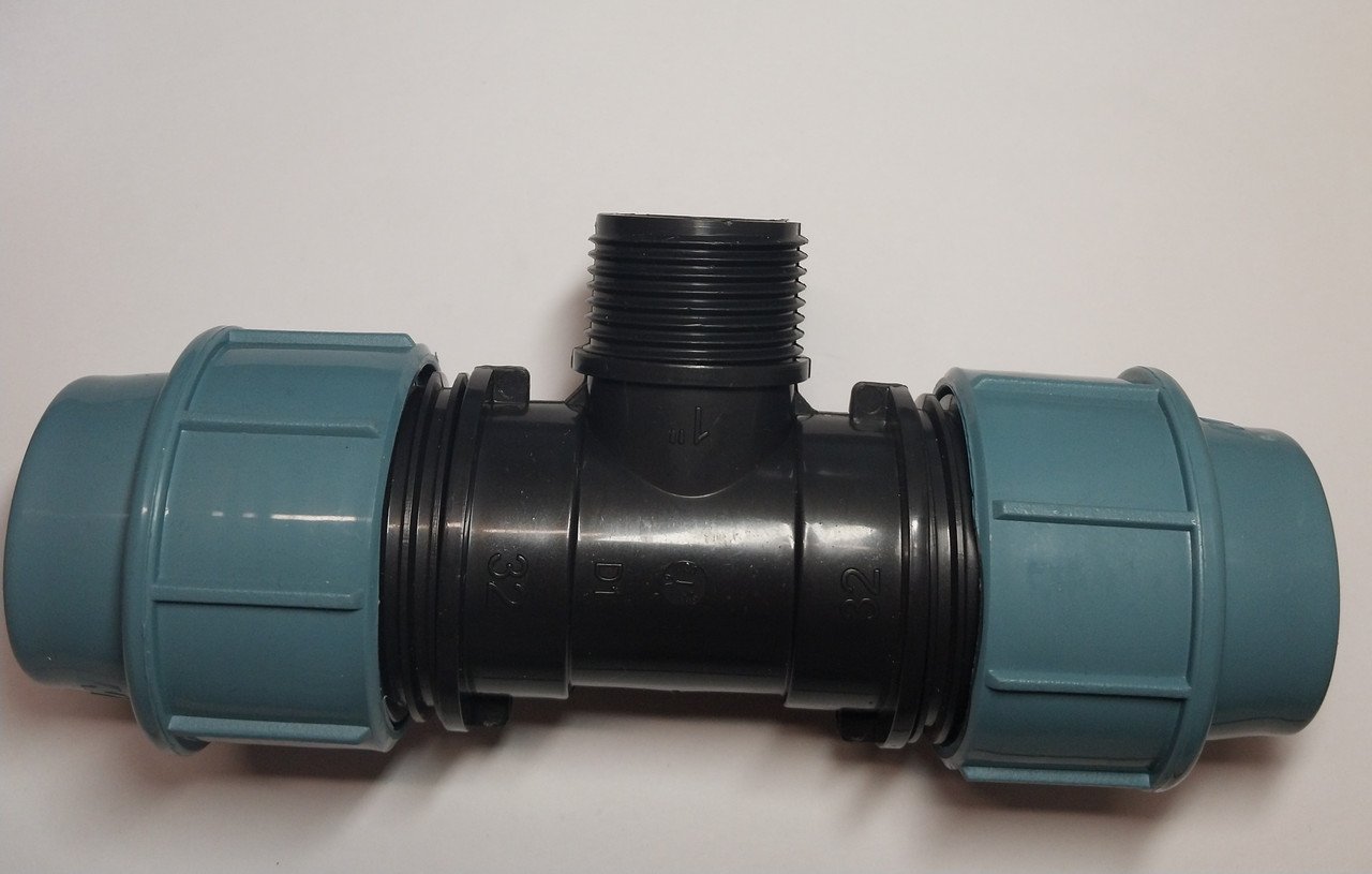 Трійник компресійний ПНД 20×1/2 Зн×20 мм – фітинг для створення розгалуження ПНД труби 20 мм з центральним різьбовим відводом 1/2 дюйма Зовн.