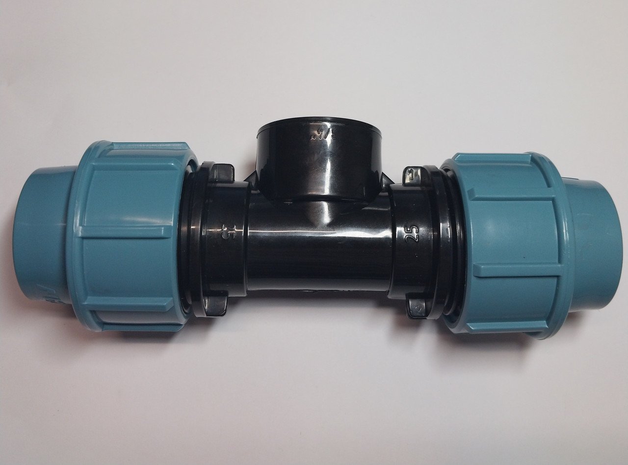 Трійник редукційний ПНД 25×20×25 мм – фітинг для розгалуження ПНД труби, де центральний відвід має менший діаметр (20 мм), ніж основна магістраль (25 мм).