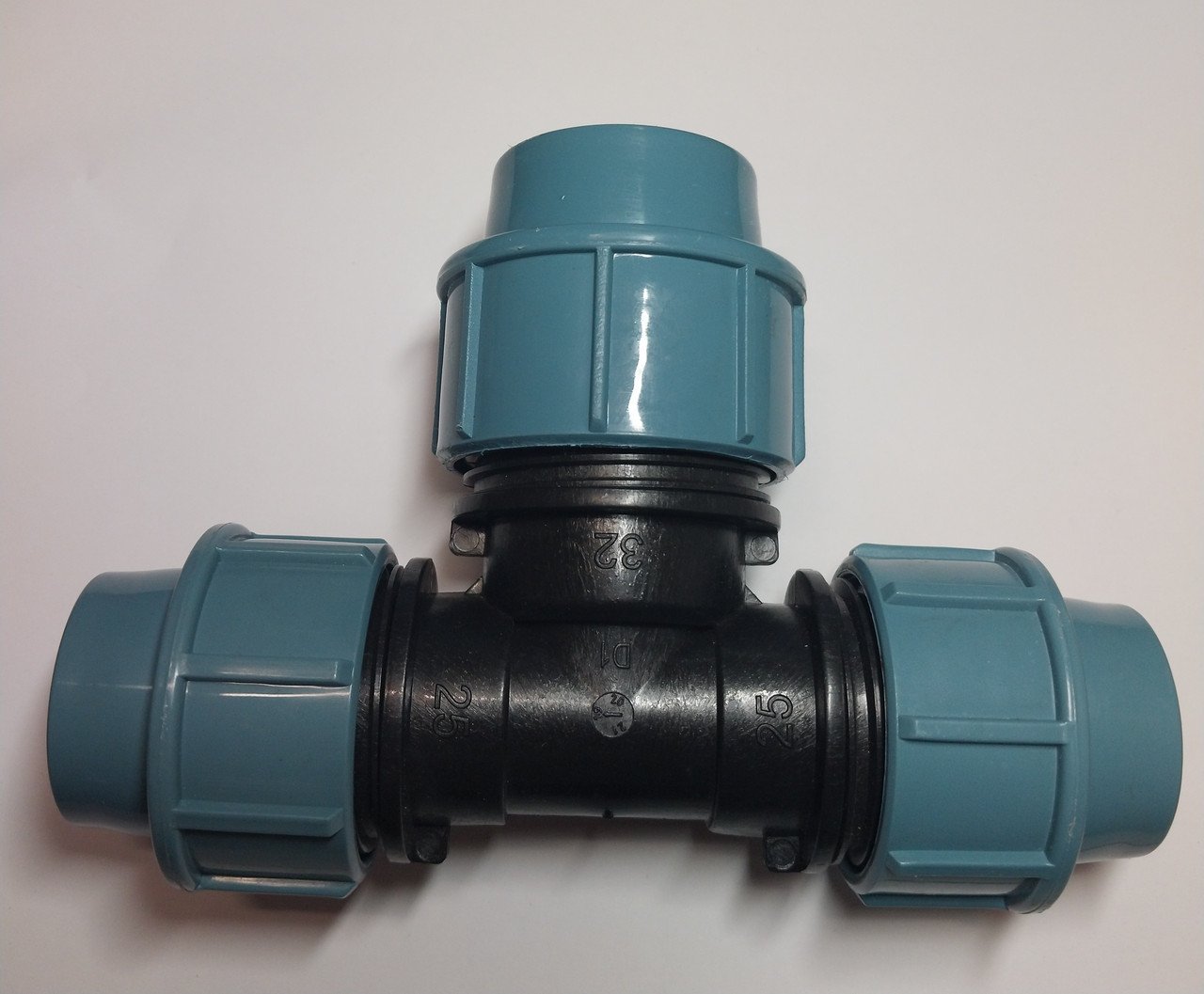 Трійник редукційний ПНД 32×25×32 мм – фітинг для розгалуження ПНД труби, де центральний відвід має менший діаметр (25 мм).