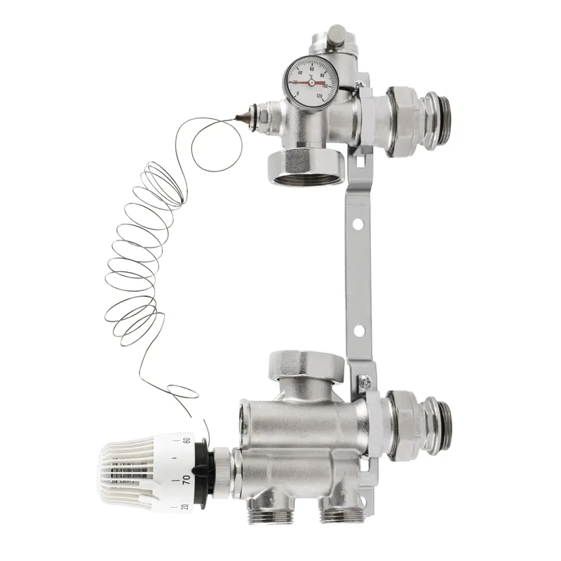 Центральний елемент для систем водяної теплої підлоги, призначений для змішування гарячого теплоносія з котла з охолодженим теплоносієм, що повертається з підлогового контуру. Це забезпечує підтримку безпечної та комфортної температури подачі 30–45 °C. Вбудований байпас запобігає надмірному тиску та захищає циркуляційний насос.